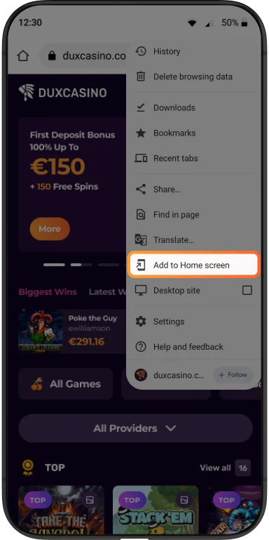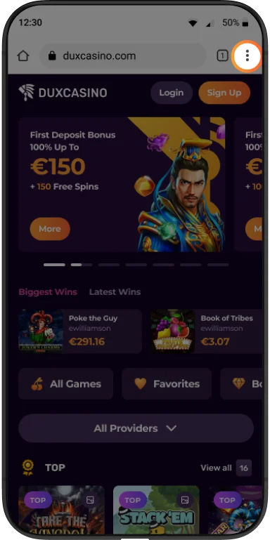 Open Duxcasino in Chrome browser on your Android device